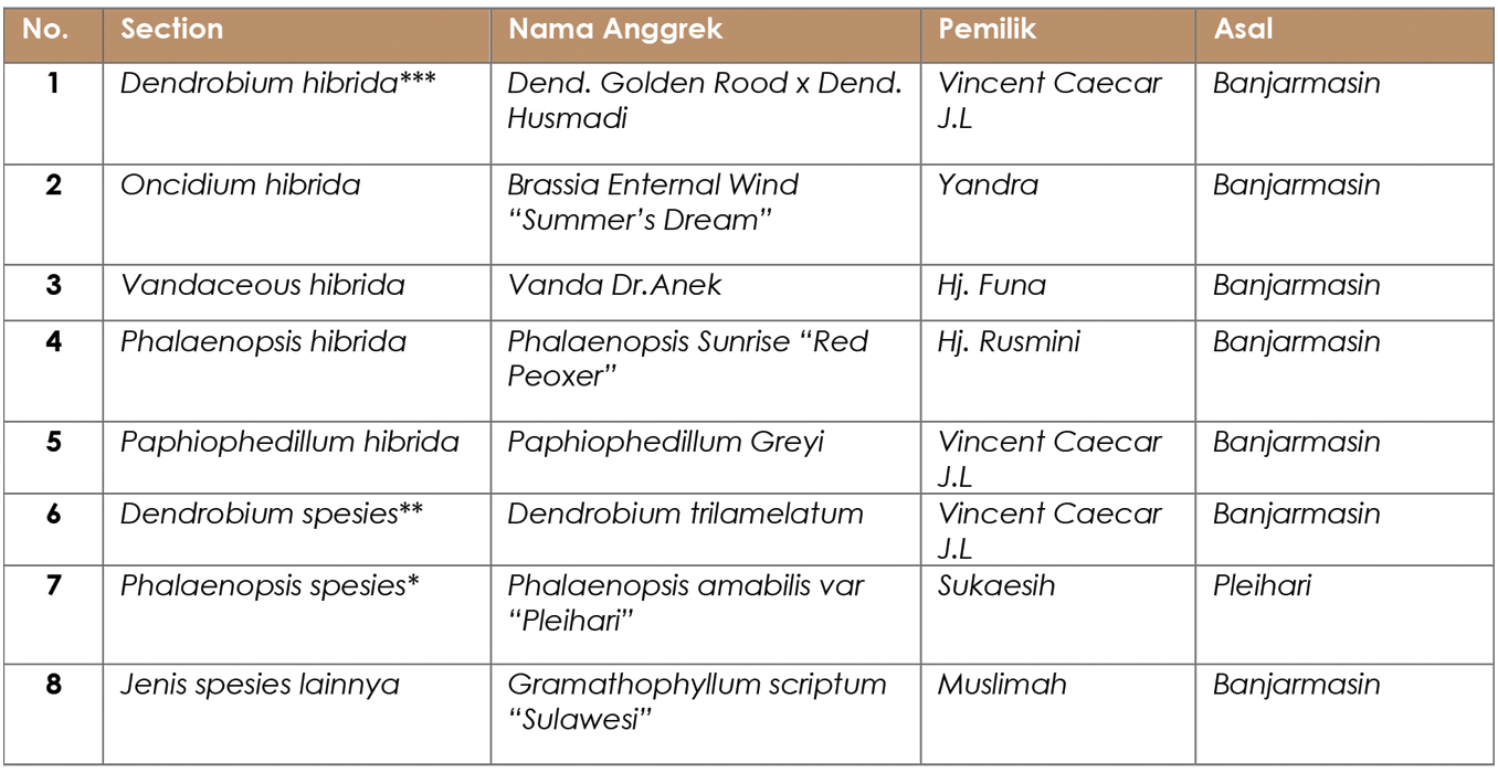 Di samping best of species, best of hybrid, dan best of show, kontes yang diselenggarakan PAI cabang Banjarmain bekerja sama dengan perumahan Citra Garden itu juga melakukan pemilihan best of species borneo. Kontestannya, pemenang anggrek spesies asal Kalimantan di setiap section.
